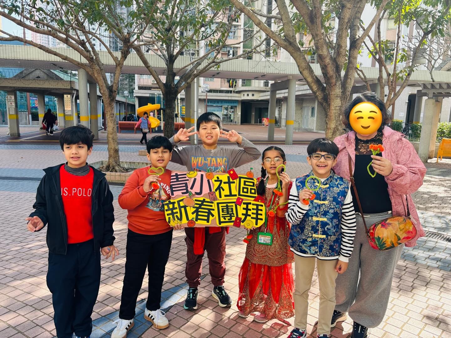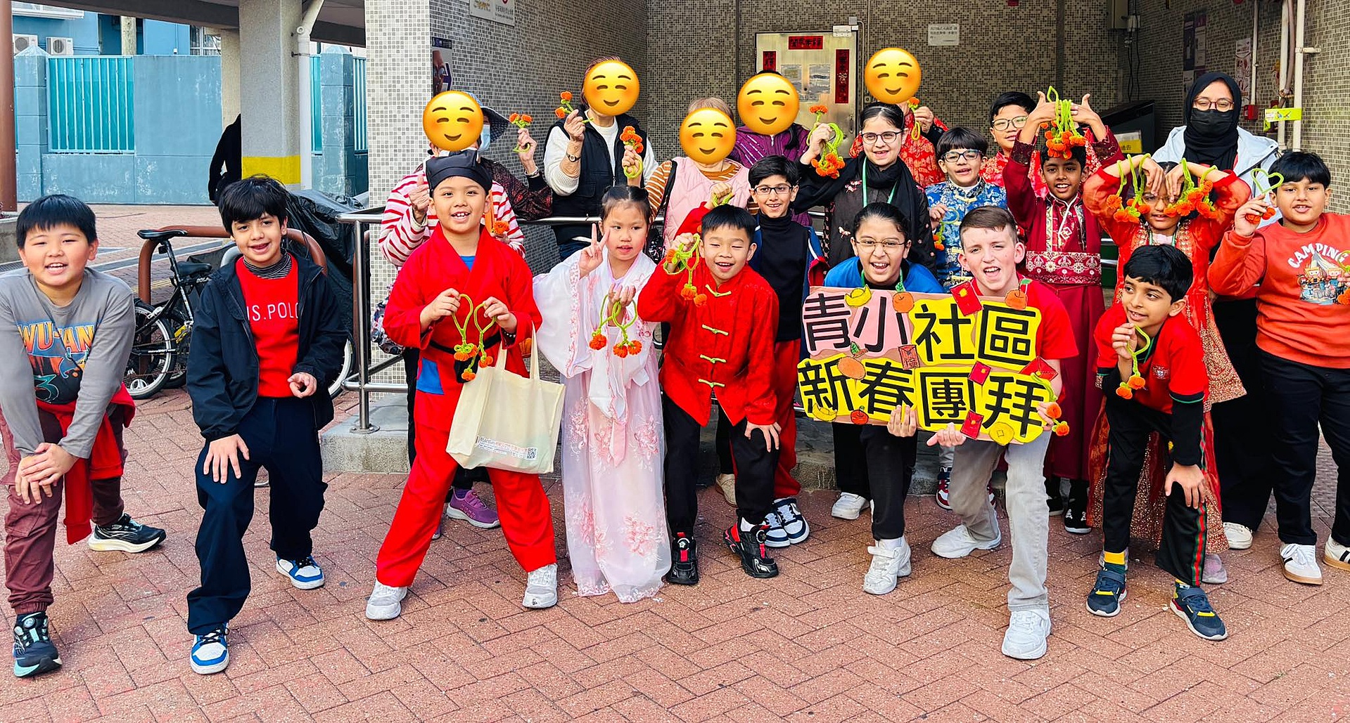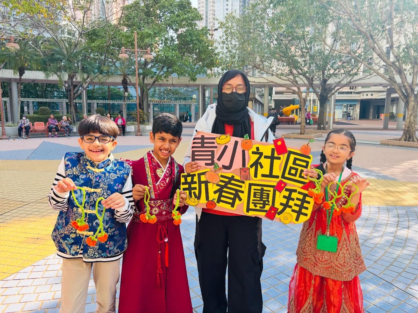 本校於家校新春文化團圓日當天舉辦了「非華語學生社區新春團拜活動」,由老師帶領非華語學生前往學校鄰近社區進行新春團拜。青小學生親手製作了超過一百對絨絲年桔,贈予區內居民,傳遞新年祝福。