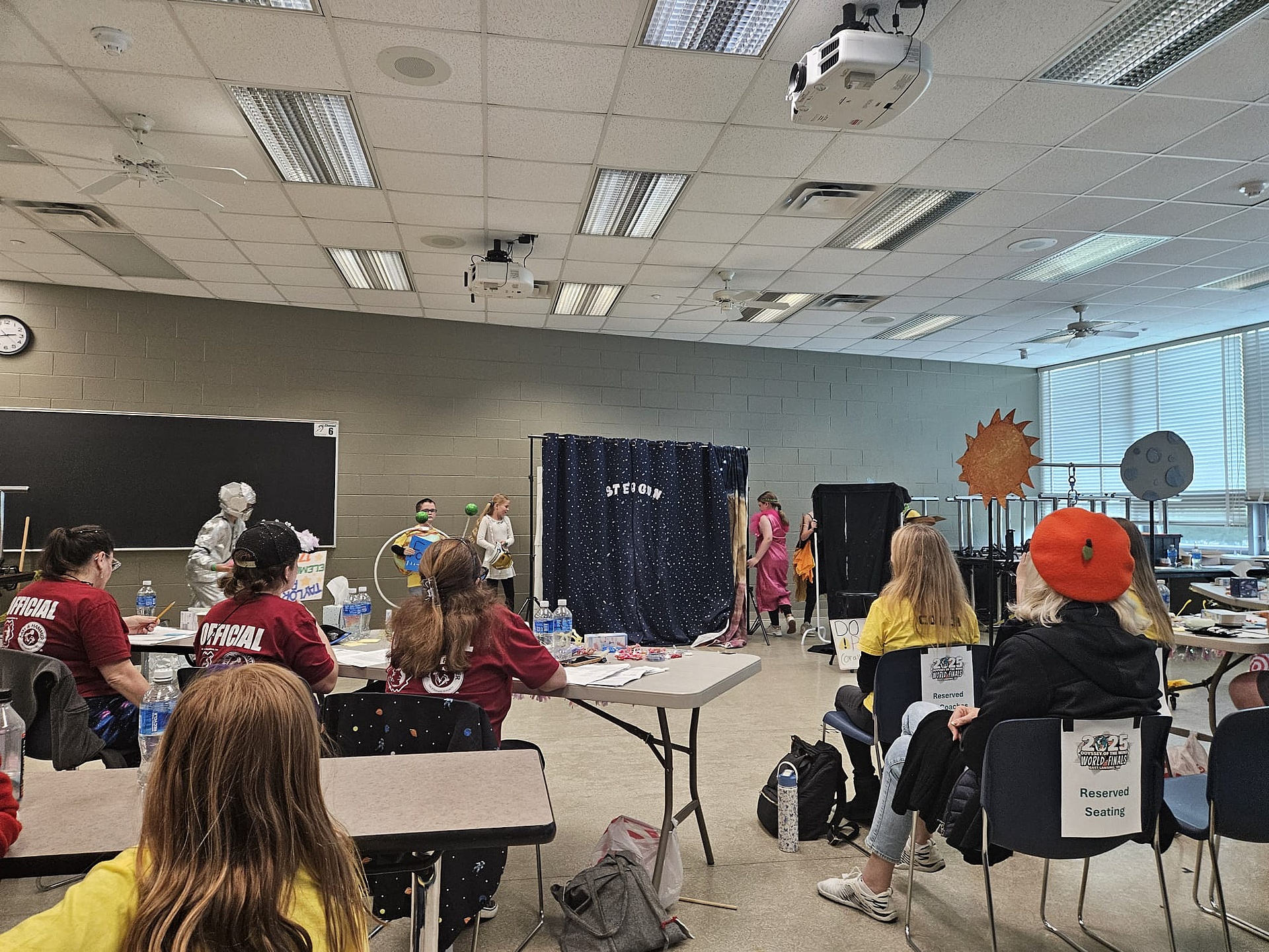 來到美國備戰多天,終於到了第一個比賽項目-即興解難題目。青童在沒有教練陪同情況下,在神秘的房間中互相合作即場解難裁決提出的難題。來自佛羅里達州威尼斯市的Buddy team教練Ms Jackie在賽前為青童作提點及練習,好似學生們可以輕鬆心情去應付難題。經過20分鐘的漫長作戰後,大會場地門外已聚集了一群支持者,為完成賽事的隊伍送上祝福及欣賞。