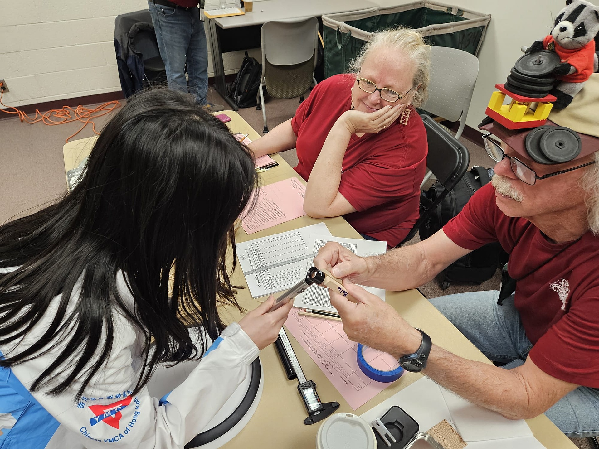 今天是比賽的最後一天,青童們在早上9時半出戰長題目4比賽。在比賽前1小時,隊伍需要把木結構攜到裁判房進行檢測,讓裁判檢查木結構的高度,重量,使用的膠水,木條的質量等等,過程十分嚴謹。裁判亦會在交談過程中教授隊伍一些技巧和心得。