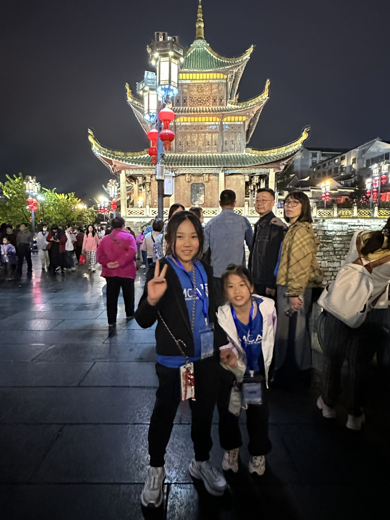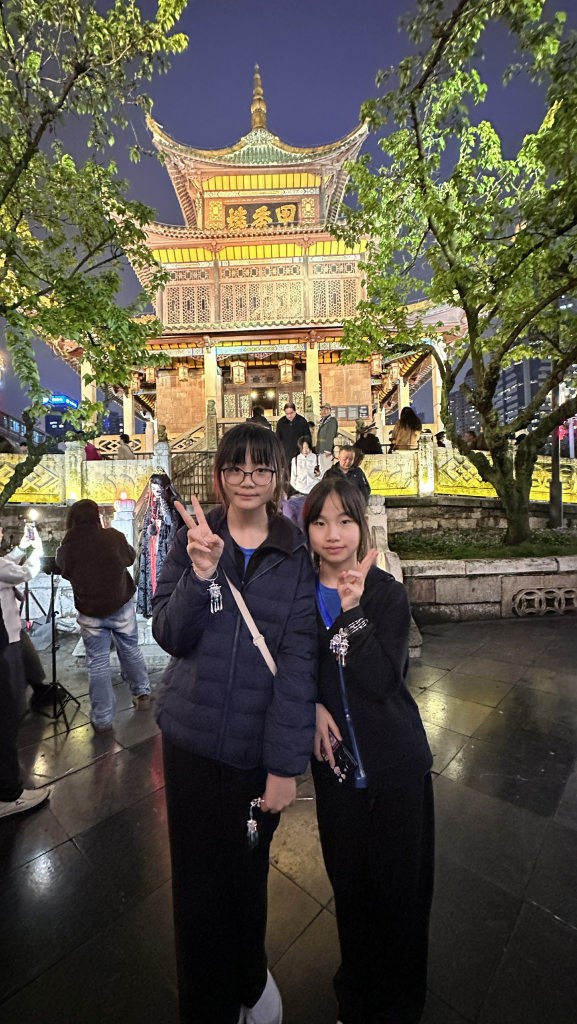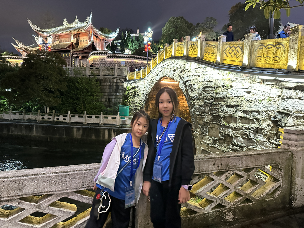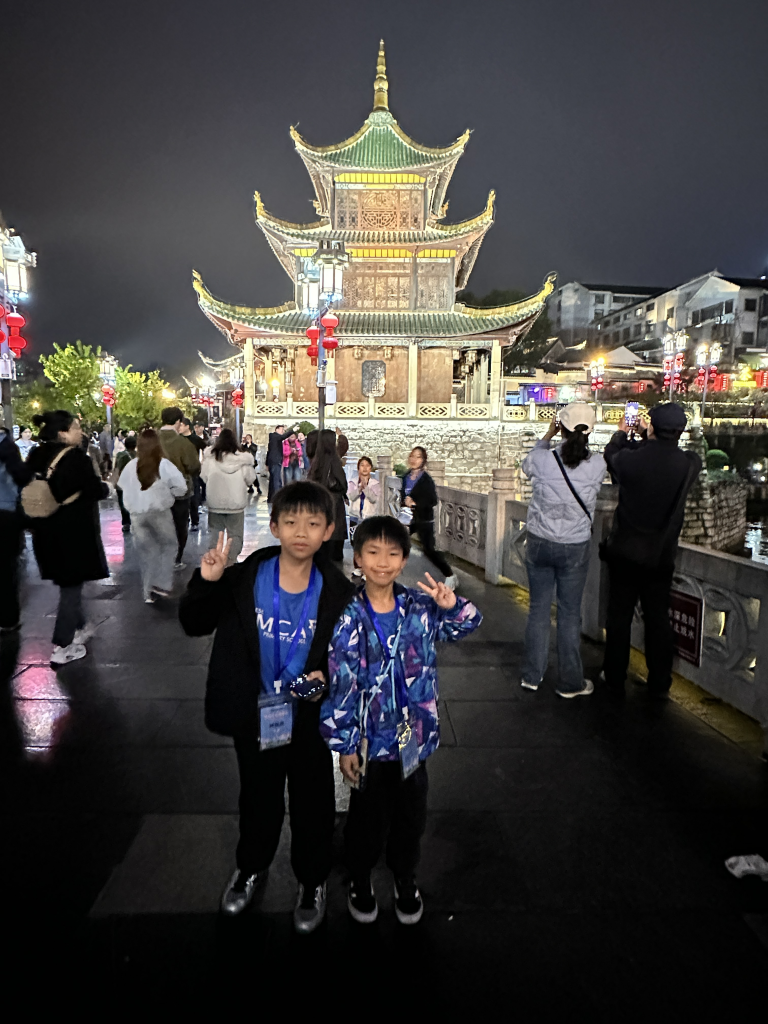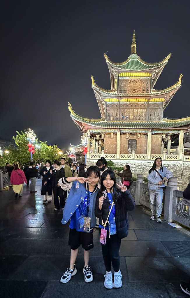 晚上,我們散步到南明河畔,參觀貴陽的地標—甲秀樓,寓意「科甲挺秀」,希望多出人才。作為始建於明代萬曆年的古建築,夜晚亮燈後尤其漂亮。暖黃色的燈光勾勒出樓閣的輪廓,倒映在河水中,把整片星空都揉進了南明河。而連接甲秀樓的是一座長長的石橋—浮玉橋。同學牽著手,慢慢走,感受涼爽的河風,欣賞朱紅廊柱在燈光下的倒影,被吹成细碎的流光。