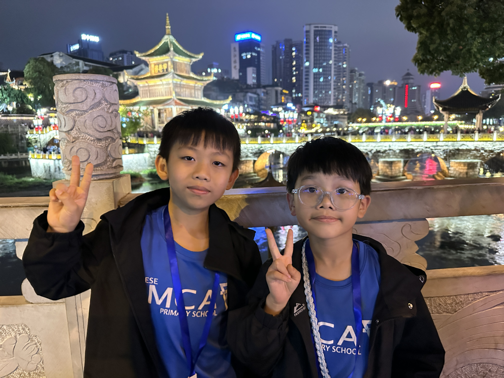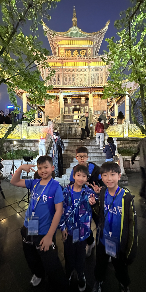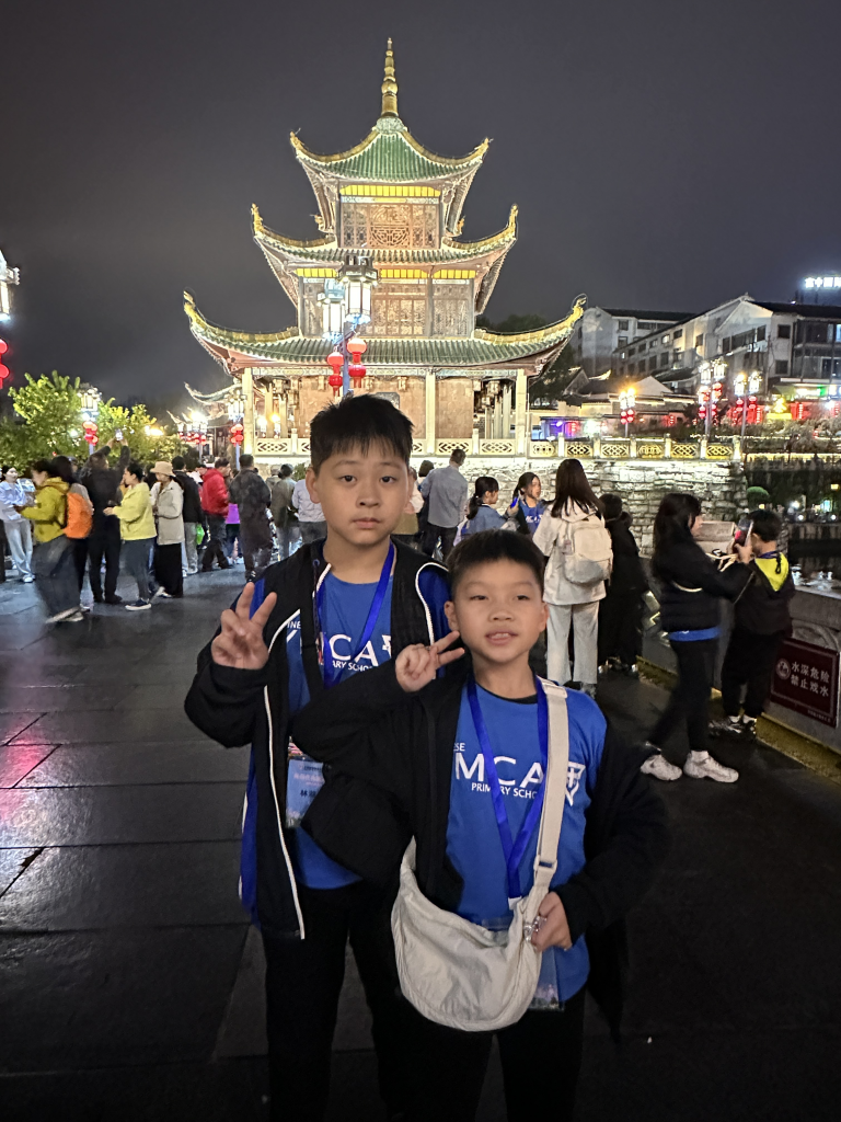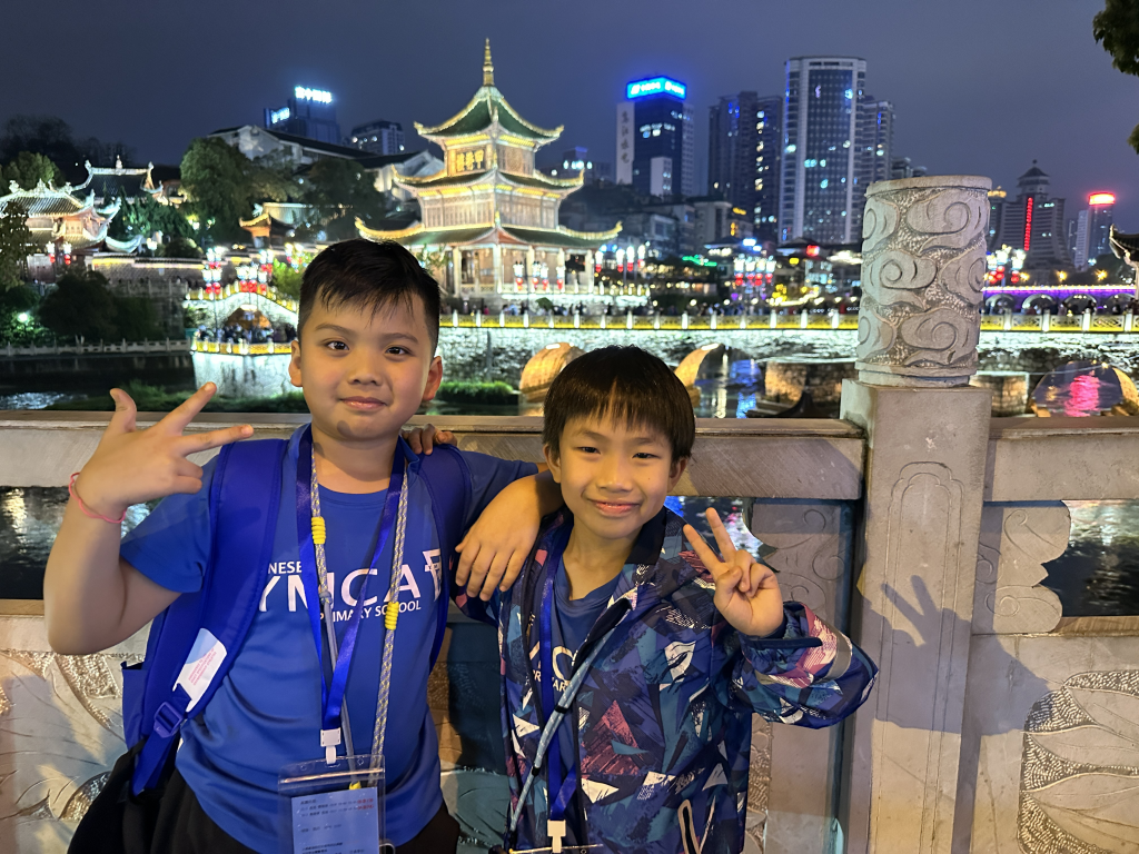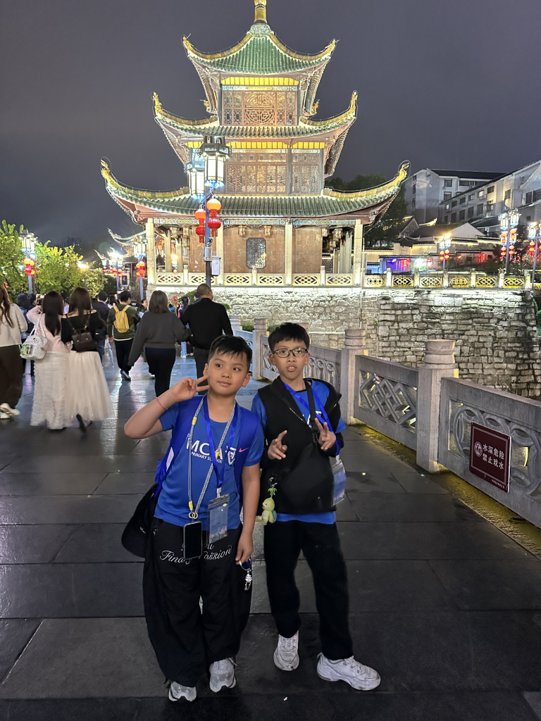 晚上,我們散步到南明河畔,參觀貴陽的地標—甲秀樓,寓意「科甲挺秀」,希望多出人才。作為始建於明代萬曆年的古建築,夜晚亮燈後尤其漂亮。暖黃色的燈光勾勒出樓閣的輪廓,倒映在河水中,把整片星空都揉進了南明河。而連接甲秀樓的是一座長長的石橋—浮玉橋。同學牽著手,慢慢走,感受涼爽的河風,欣賞朱紅廊柱在燈光下的倒影,被吹成细碎的流光。